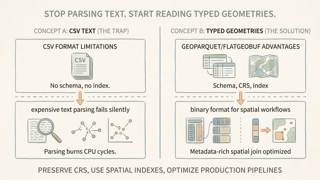 CSV files are a trap for spatial workflows. No CRS. No schema enforcement.…