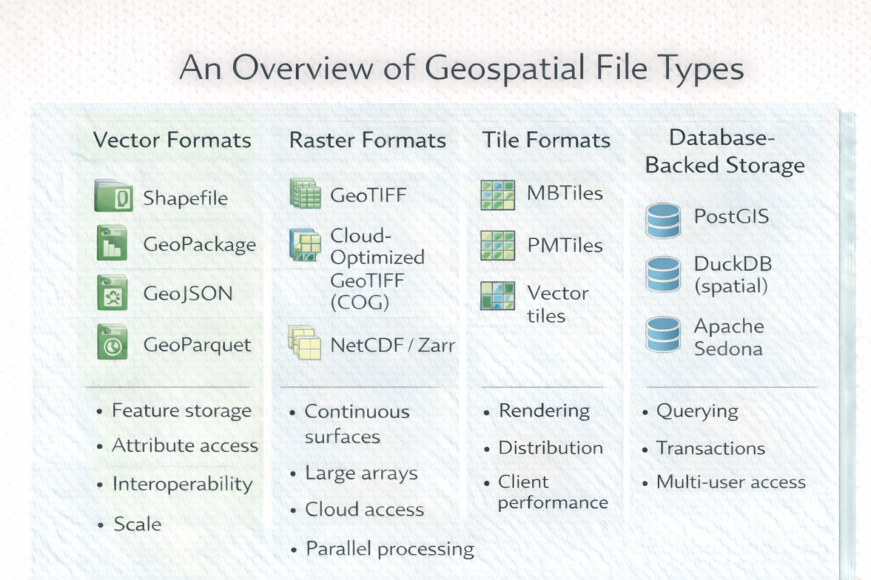 The mistake: forcing one format everywhere. Shapefile for everything. Or storing tiles in a database. Each format solves a specific problem.