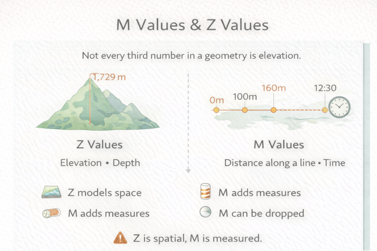 The rule: Z is where (spatial). M is how far or when (measured). Use M for roads with mileposts, streams with elevation profiles, or time-series data. Don’t discard M without thinking. Use Z only if elevation or depth matters to your analysis. Check if your tools even preserve it before investing in 3D workflows.