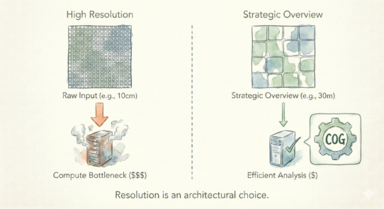 Cloud-native GIS is object-storage first. Data sits in S3, Azure Blob, or similar, not in databases or file servers. Compute and storage are decoupled. Multiple processes read the same data without locking. A 50GB raster doesn’t load fully into memory—HTTP range requests pull only the bytes needed.
