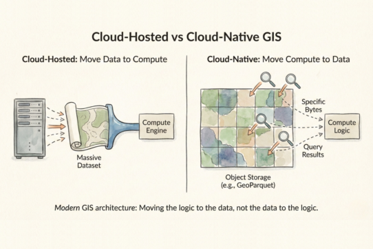 The rule: If your data lives in object storage, your GIS should read it there. If you’re moving terabytes, cloud-native pays for itself. If you’re doing one-off desktop analysis, traditional GIS is fine. Modern GIS is built for reading less, not moving more.