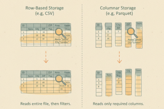 This changes everything. Traditional GIS copies data to your machine to work with it. Cloud-native GIS reads data where it lives. Formats like GeoParquet and Cloud-Optimized GeoTIFF are designed for this: column-oriented storage, internal tiling, overviews. A query touching 1% of a dataset reads 1%, not 100%.