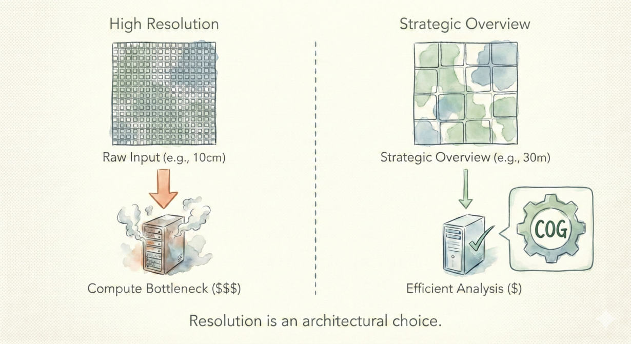 The rule: Query the resolution that answers your question, not the highest resolution available. If the pixel size is smaller than your error margin, you’re overpaying. Use overviews aggressively. Downsample before analysis, not after.
