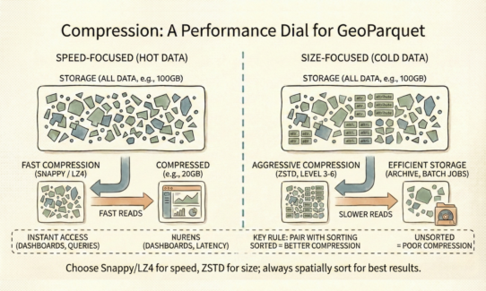 The rule: Sort data by space before writing. Chunk by size. Unsorted GeoParquet performs worse than GeoJSON. Structure determines efficiency, not the query.