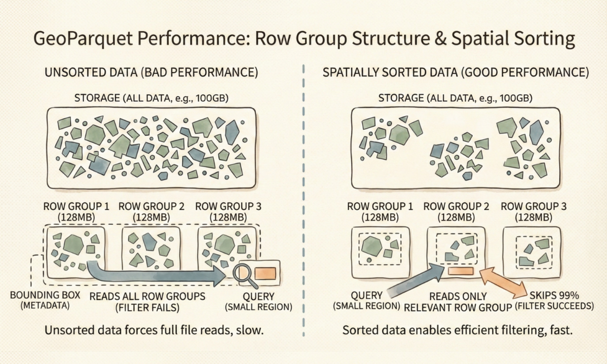 Your GeoParquet performance is fixed the moment you write the file. It’s determined by how you structure row groups and whether data is spatially sorted. The query engine can’t save bad data layout.