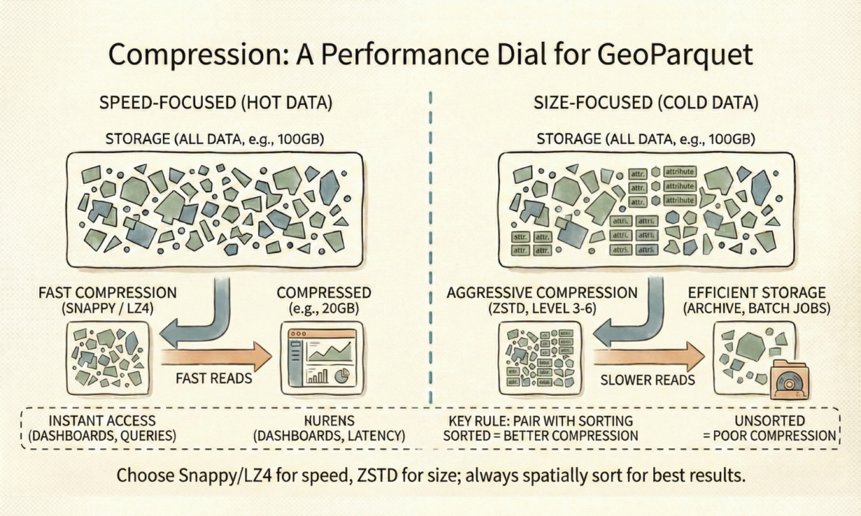 Most teams default to Snappy compression for GeoParquet and wonder why their egress bills are massive. Compression choice depends on how you’ll access the data—speed or size.