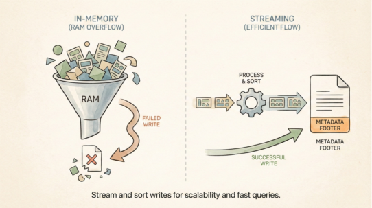 Columnar storage makes compression brutal. A column of 10 million identical geometries (WKB binary) compresses far better than interleaved JSON. A column of 10 million repetitive attributes (state codes, land use types) compresses even harder. Grouping similar data enables algorithms to find patterns.