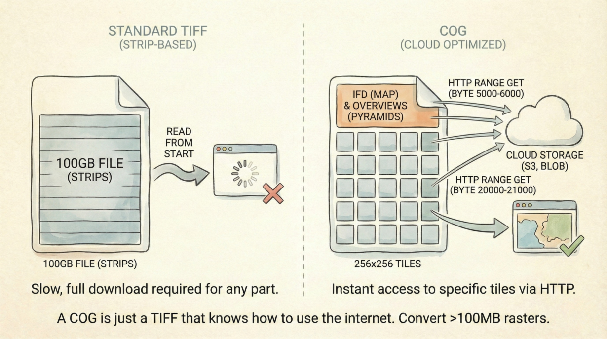 The rule: Convert rasters >100MB on cloud storage to COG using gdal_translate -of COG input.tif output.tif. Stop building GIS servers to serve static files. Let HTTP do the work. COGs eliminate the bottleneck entirely.