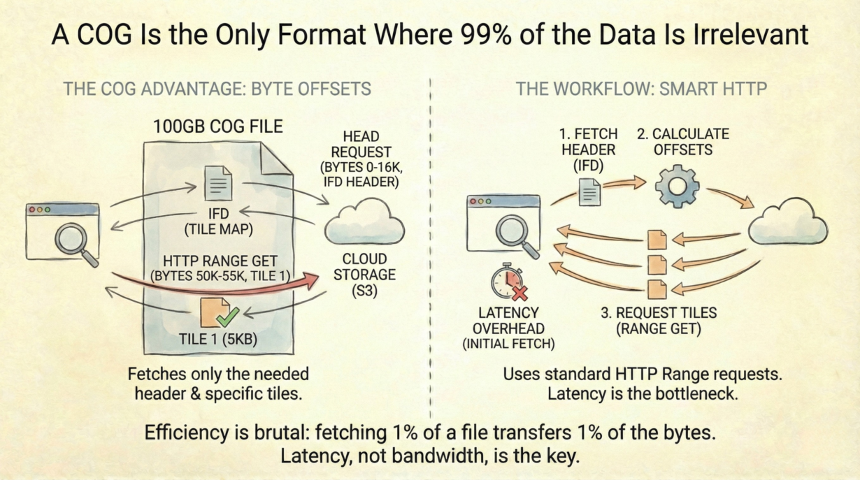 The “magic” of streaming a 100GB raster from a browser is actually simple: byte offsets. A COG tells you exactly where the pixels you need live on disk. Then HTTP lets you ask for just those bytes.