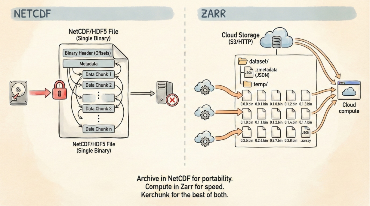 The rule: Archive in NetCDF for history and portability. Convert to Zarr for speed. Kerchunk for reading old data fast.