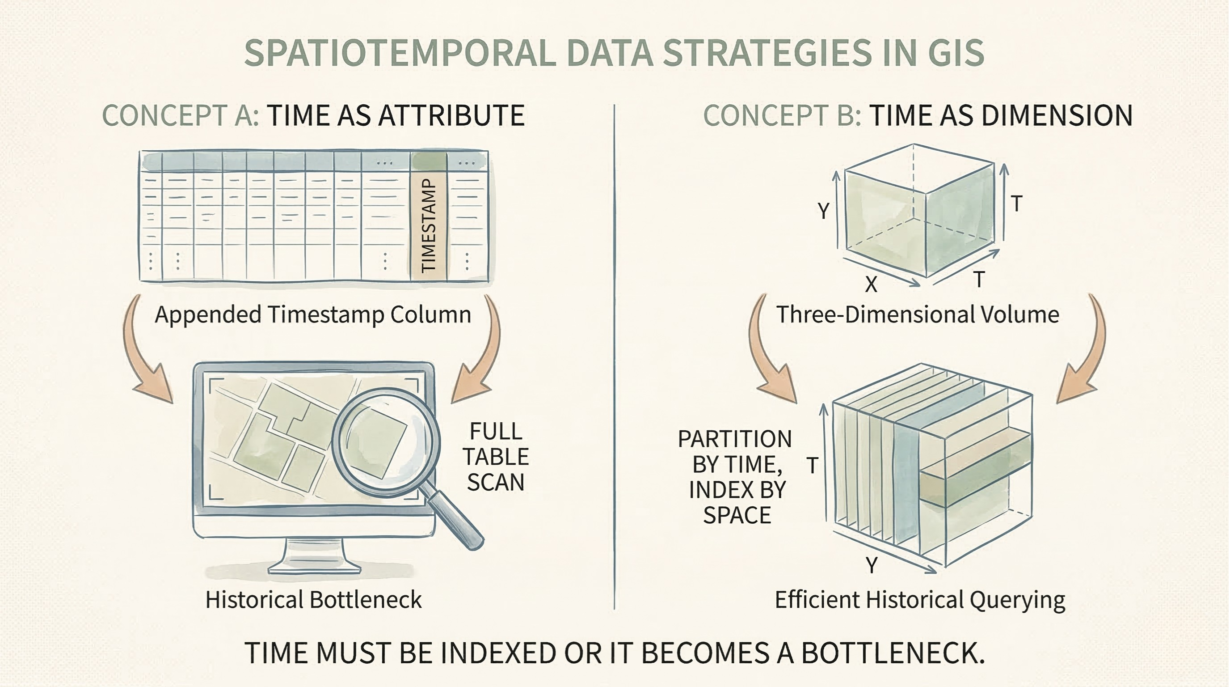 Time is indexed or it’s a bottleneck. Static GIS queries filter: “parcels in this zone.” Spatiotemporal queries filter three dimensions: “parcels in this zone at this date.” If time isn’t in your index, you scan every row. That’s the difference between 1 second and 1 hour.
