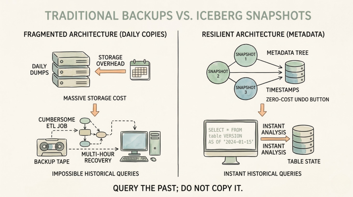 Query historical data instantly: SELECT * FROM table VERSION AS OF '2024-01-15'. Iceberg reads from the snapshot taken on that date, using the exact file references that existed then. No restore job. No multi-hour recovery. Metadata operation.