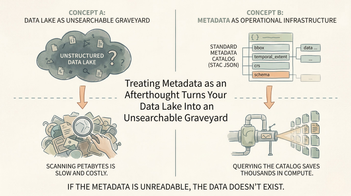 Metadata is an active index. A bounding box in metadata lets systems skip entire regions without reading the data. A temporal extent answers “does this dataset cover 2023?” instantly, without scanning files. A standardized CRS field prevents silent projection errors. This is not metadata for humans—it’s metadata for pipelines.