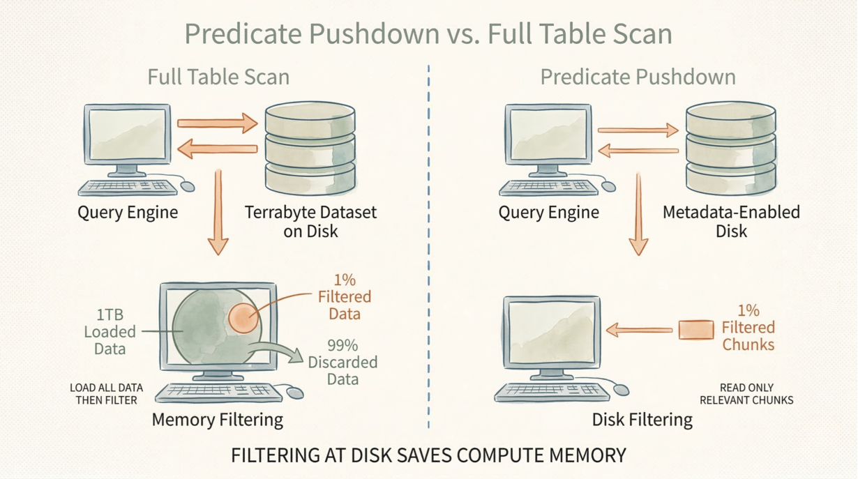Filtering at disk beats filtering in memory. Traditional workflows load a dataset, then filter: “Give me all features in this region.” The entire dataset—geometry, attributes, everything—crosses the network into RAM. Then the query engine applies the spatial filter and discards 99%. You paid to move and store terabytes of garbage.